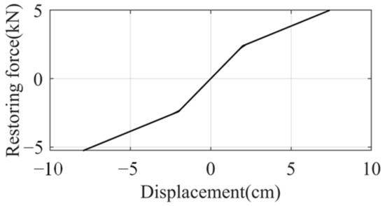 The nonlinear model is still a three-story frame [39]. The mass of each floor was 1000 kg. The initial inter-story stiffness was 120 kN/m. When the frame was in the linear scope, the natural frequencies were 0.73, 1.74, and 2.93 Hz. The damping ratios were 1.42%, 4.56%, and 5.08%. The nonlinear restoring force (see Figure 18) was adopted only on the base floor. When the inter-story displacement exceeded 2 cm, the stiffness reduced by 60%. The remaining two floors had linear stiffness. The mass, damping, and initial stiffness matrices are: