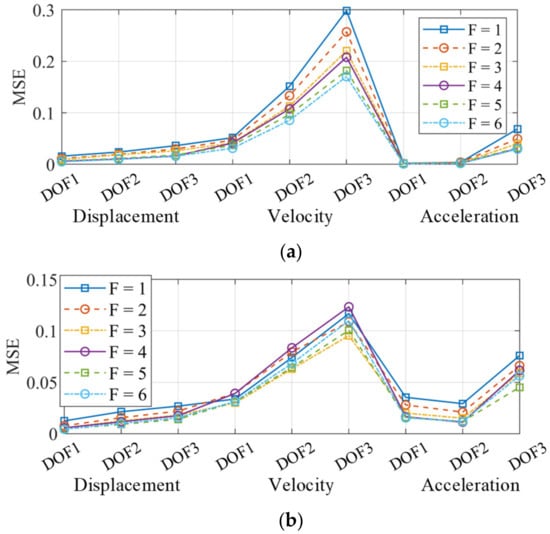 The responses’ MSEs at all DOFs are shown in Figure 20. The MSE distribution in Figure 20a can better illustrate the influence of the kernel number. With a greater F, the MSEs of all responses decreased. When F increased from one to six, the kernel and parameter numbers multiplied by six times, which could lead to a more serious overfitting effect given an identical training dataset. However, the MSEs did not become worse, which indicated that the positive influence overwhelmed the negative influence when increasing the network complexity. In Figure 20b, the MSEs of displacement and acceleration still decreased with a greater F. However, the MSE of velocity did not monotonously decrease and it only has a decreasing trend. This is partly because the mapping from acceleration to velocity is more complex (the phase difference between velocity and acceleration is /2, rather than ).