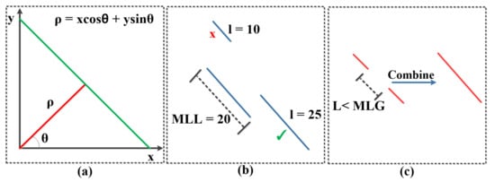 PPHT algorithm parameters illustration. (a) and of a line in polar coordinates. (b) Minimum line length condition to accept or reject lines. (c) Maximum line gap (MLG) condition to combine two points or line segments.