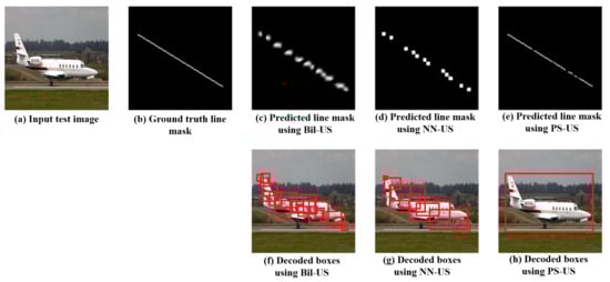 Comparison between the predicted line mask and the decoded boxes in case of using the bilinear up-sampling (Bil-US), nearest neighbor up-sampling (NN-US), and pixel-shuffle up-sampling (PS-US).
