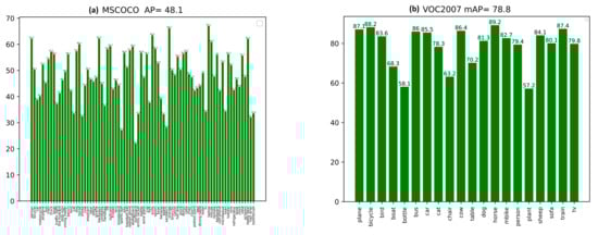 (a) The obtained evaluation mAP value of each class of PASCAL VOC2007 test set and the overall mean AP value at IOU of 0.5; (b) the AP value for each class MS-COCO minival and the overall mean value of AP.