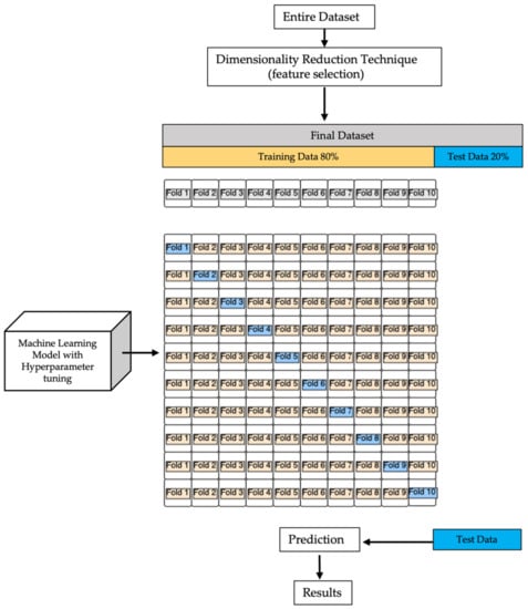 Machine learning block diagram model. After we reduced the dimensionality of the entire initial dataset, we split the final set into two subgroups: training set (80% of data) and test set (20% of data). On training data, we performed k-fold cross-validation (k = 10), as shown in the diagram. To make a prediction on training data, after grid search hyperparameter tuning, we evaluated the real output (test data), and we analyzed the results by classification performance for each classifier.