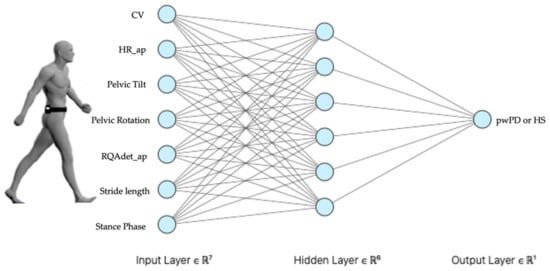 Multilayer perceptron (MLP). Our MLP with seven neurons in input layer, consequently features chosen by dimensionality reduction methods, six neurons in hidden layer, chosen by grid search method, classify our dataset in output layer to predict pathological or healthy subjects’ gait: CV, coefficient of variation of step length; HR ap, harmonic ratio anteroposterior; RQAdet_ap, % determinism in the recurrence quantification analysis anteroposterior; pwPD, people with Parkinson’s disease; HS, healthy subjects.