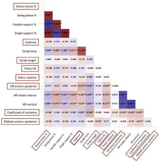 Out of the initial 22 gait parameters (Table 1), 14 showed significant differences in the independent sample t-test, regardless of gait speed (Table 1). We submitted to a clinical decision for those variables that reported a partial correlation value ≥ 0.50 with at least another feature (Figure 4). For example, stance phase was highly correlated with swing phase, double support, and single support. Because stance phase is complementary to swing phase and contains the information on support phases, we decided to maintain stance phase only in the final dataset. Another issue was the relationship between each gait stability index in the three spatial directions. We decided to maintain in the final dataset only HRap and RQAdetAP because of their clinical significance [5].