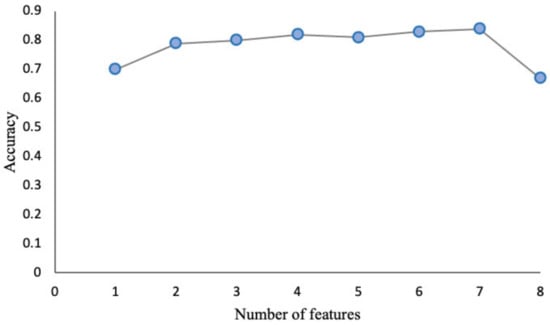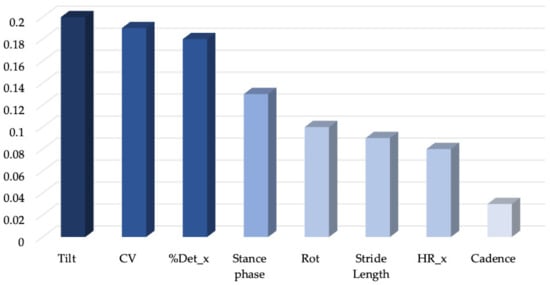 Eight variables (Figure 5) were finally selected to input into SBS and random forest algorithms. Figure 6 and Figure 7 report the SBS and random forest selection algorithms results, respectively. SBS revealed that the performance capability of the classifier was excellent for seven out of the eight previously selected features, with the cadence lowering the accuracy of the dataset according to RF. As a consequence, a dataset of seven features was input into the supervised ML algorithms to assess their ability to classify the gait abnormalities of pwPD. A description of the selected gait parameters is described in the Supplementary Materials.