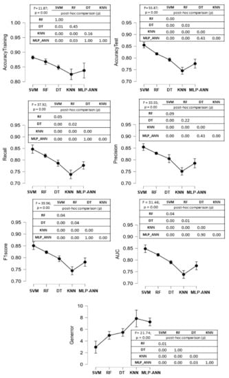 Comparison between the classification performance measures in the 7-features model. The mean and standard deviation values of the 10 runs for each performance measure for each ML algorithm are shown in the figure. The F values of the ANOVA procedure are reported, as well as the p-values of Bonferroni’s post hoc analysis.