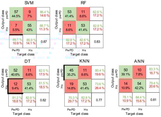 Confusion matrices. Representation of the confusion matrices evaluated for each algorithm after feature selection and during the run that displayed the highest accuracy value for each of them, The correct predictions are shown in green, while the wrong ones are shown in red.: PwPD, people with Parkinson’s disease; Hs, healthy subject; SVM, support vector machine; RF, random forest; DT, decision tree; KNN, K-nearest neighbor; ANN, artificial neural network.
