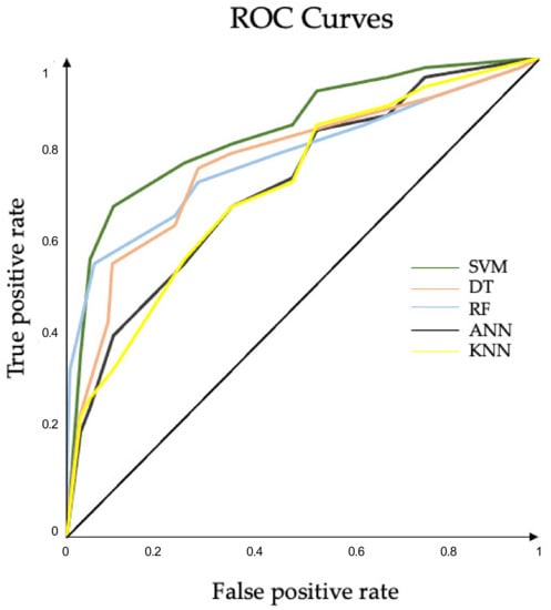 A significant main effect of the ML algorithms was found for all the performance measures. SVM outperformed DT, KNN, and ANN in all the classification performance measures and showed comparable precision values when compared with RF. In terms of precision and generalization error, no significant differences between RF and DT were found. Except for generalization error, no significant differences between DT and ANN were found in any of the classification performance measures (Figure 7). The confusion matrices and ROC curves for the maximum accuracies obtained by each classifier are reported in Figure 8 and Figure 9, respectively.