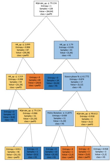 In the majority of cases, discrete splitting functions are univariate. A split in an internal node based on the value of a single attribute is referred to as “univariate”. As a result, the inducer seeks out the best attribute on which to split the data. There are numerous univariate criteria from which to choose. According to the origin of the measure: information theory, dependence, and distance. According to the structure of the measure: impurity-based criteria, normalized impurity-based criteria, and binary criteria. We used grid search to optimize two hyperparameters: the impurity-based criterion and the maximum depth of the tree. The best accuracy was obtained by building our decision tree with a maximum depth of five and the entropy impurity criterion.