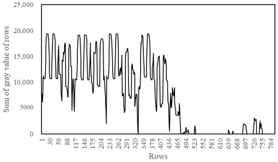 where , is the pixel value of the r-th row and the c-th column of the binarized image and represent the accumulated value of the grayscale of each row of pixels, so that the horizontal projection curve of the binary image is obtained, as shown in Figure 5.