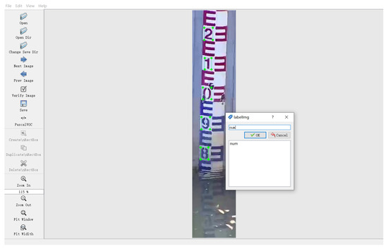 Similar to Section 3.1.1, LabelImg is used to label all scale characters in the water gauge images. An example of labeling is shown in Figure 7.