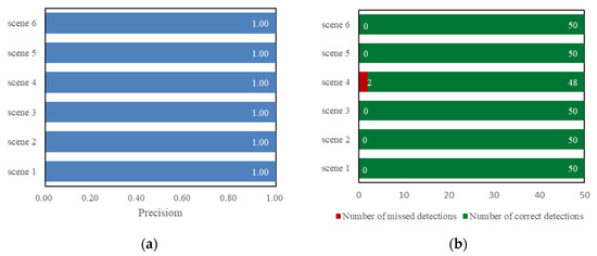 Water gauge detection model performance. (a) Detection precision; (b) Object missed detection. Scene 1, scene 2, scene 3, scene 4, scene 5, and scene 6 in the figure represent scenes with good daylight, infrared lighting at night, strong light, transparent water body, rainfall, and dirty water gauge, respectively.