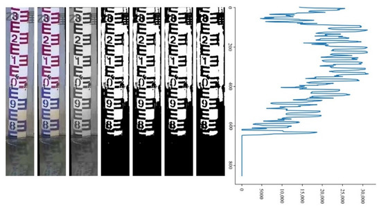 Water surface line recognition is a critical step which directly affects the correctness of the water gauge reading. When detecting the water surface line, Hough transform, grayscale, denoising, and binarization are performed on the water gauge area detected by YOLOv5s to obtain a binary image, in which the water gauge appears as a black and white texture area. The classic effect of water level recognition is shown in Figure 11. The images from left to right are the original image, the tilt corrected image, the grayscale image, the binarized image, the Gaussian filtered image, the median filtered image, the binarized image, and the horizontal projection curve graph.