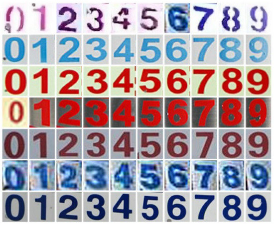 In the process of character recognition model training, the batch size is set to 96, the Adadelta optimizer is used for optimization, and the total number of iterations is set to 2000. In order to evaluate the performance of the scale character classification model of the water gauge, RGB color images from 0 to 9 categories were collected according to the color, posture, and clarity of the scale characters to form a test dataset with 50 images per category, for a total of 500 images (Figure 12).
