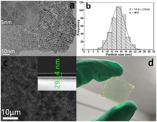 (a) TEM characterization of CsPbBr3 nanocrystals. (b) The size distribution of the nanocrystals. (c) Scanning electron microscopy (SEM) characterization of CsPbBr3 perovskite thin films with thicknesses of 300 nm. (d) Macroscopic films.