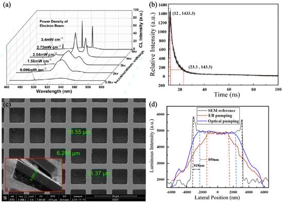 The radiation spectrum changes in CsPbBr3 quantum dot films bombarded with an accelerated EB are shown in Figure 3a. In order to make CsPbBr3 nanocrystals continuously pumped by multiple scattered electrons before depolarization, accurately measuring the temporal coherence and spatial coherence of perovskite quantum dots pumped by an EB will be crucial for the subsequent design of self-saturation luminescence experiments. For this purpose, our team completed a transient luminescence experiment on CsPbBr3 films in 2020 [38]. There is no denying that the testing result in Figure 3b is similar to some reports in academia [39,40]. The depolarization delay of CsPbBr3 films is only around several ns, even though there is a wide band gap. In particular, the temporal coherence of CsPbBr3 luminescence pumped by an EB should be in the order of 10 ns. Moreover, the spatial coherence of EB scattering in the CsPbBr3 films has been estimated in the following paper. In the vacuum testing system, the CsPbBr3 films are located at the focal plane of the microscope with a 40-times magnification. The sampling rate and accuracy of the CMOS sensor is around 140 nm, which is greatly superior to the optical transfer ability of the microscope in the 550 nm band. A metal film net is placed on the surface of CsPbBr3 films, which can block pumping EB to shape the spatial frequency information for CsPbBr3 luminescence. By observing the attenuation characteristics of space frequency information, the spatial coherence of EB scattering has been basically confirmed. According to the above methods, the characterization of the metal film-net can be shown in Figure 3c. The space frequency spectrum of EB pumping and optics pumping and SEM were measured with a pumping voltage of 5kV and are shown in Figure 3d. As shown in the figure, there is EB scattering of 800 nm in the CsPbBr3 films. The spatial coherence of EB scattering should be around the submicron order.