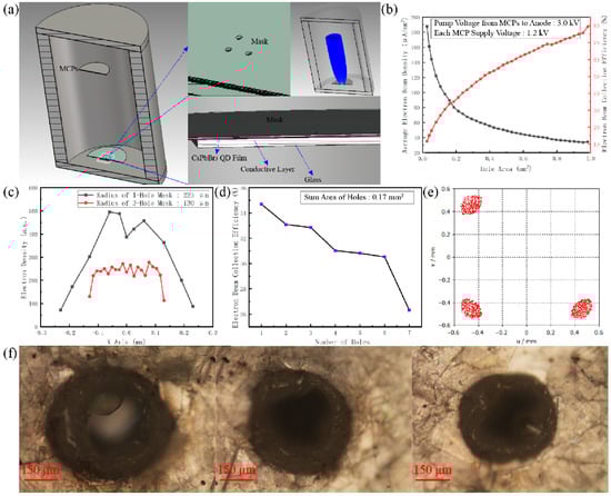 (a) Design and simulation of electron optical focusing system. (b) The effect of mask hole area on EB collection efficiency and focusing gain pump power at MCPs output of 40 μA. (c) The effect of mask hole radius on EB focusing distribution. (d) Relationship between the number of hole masks and EB collection efficiency. (e) Lectronic focal spot shapes. (f) Characterization of the three-hole anodes.