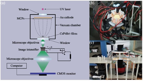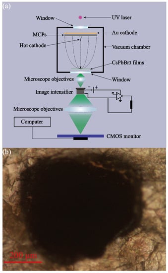 In the simulation model of Figure 4a, focusing the EB more effectively and collecting more of the pumping power’s surface density need to be further considered. According to the model in Figure 4a and conditions of Figure 4b, the output currents of MCPs can reach around 40 μA. When the mask hole on the anode is reduced to below 1 mm2, the collection efficiency of focusing the EB will decline rapidly, and the surface density of pumping power focused into the hole mask will also be enhanced promptly. From the simulated data in Figure 4b, there is an optimal parameter for the whole EB-focusing system. In the EB-focusing system, when the area of the hole mask is around 0.17 mm2, the collection efficiency and pumping-power focusing will be balanced effectively. In addition, according to the further simulation of the inside of the hole mask, if the diameter of the hole mask is too big, the distribution of EB focusing, as shown in Figure 4c, will be like a Gaussian distribution. Namely, an excessive diameter makes it difficult to smooth the distribution of EB focusing, whereas taking advantage of more tiny holes to assemble a hole of 0.17 mm2 will avoid an unsmooth distribution. Of course, Figure 4d also shows the relationship between the number of hole masks and the EB collection efficiency. Based on the above analysis, in the following experiment, we selected three hole masks to focus the EB. The whole area of three hole masks is around 0.17 mm2. Their simulated distribution is shown in Figure 4e. In order to achieve the electron focusing effect in Figure 4e, we took advantage of a ps laser to carve three holes with a diameter of 260 μm on a mica sheet with a thickness of 0.1 mm, whose characterizations are shown in Figure 4f by a microscope. The mica sheet with three holes was placed on the CsPbBr3 luminescence films to shape focus anodes. The schematic diagram of the self-saturated luminescence experimental device is shown in Figure 5a. Figure 5a mainly includes the vacuum device part and the luminescence testing part. In the vacuum device part, a Au photocathode can be triggered by the UV laser to yield some ideal photoelectrons. The photoelectrons are amplified into EB by the MCPs. By the EB-focusing system and external pumping field, the EB is charged enough kinetic energy to bombard the CsPbBr3 films across the three holes. In the luminescence testing system, as the anode of the vacuum device part, the three holes and CsPbBr3 films are placed on the focus plane of the microscope in the objective space. The light from the three holes will be transferred to the photocathode of the image intensifier located at the focus plane of the microscope in the imaging space. The intensity variation in CsPbBr3 films’ self-saturation luminescence can be quantificationally measured from anode currents of the image intensifier by remoting voltage between both sides of MCPs. The imaging information of the three holes can be also collected by the below CMOS monitor. The imaging information can qualitatively and immediately reflect the degree of self-saturation luminescence. The vacuum device part and luminescence testing system have been shown in Figure 5b,c, respectively.