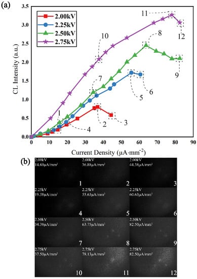 Based on the system and devices shown in Figure 5a, we carried out the following experimental steps. Firstly, by accurately adjusting the voltage between both sides of the MCPs from 1200 V to 600 V, the current’s intensity of pumping EB is accurately decreased from 10 μA to 0.1 μA, and further, the pumping current’s density across the three holes can be effectively operated. The anode current’s intensity of the image intensifier is closely related to the luminescence intensity from the three holes only. Therefore, a self-saturation luminescence of CsPbBr3 pumped by an EB can be directly modeled in Figure 7a. As can be seen, when selecting pumping voltages, CsPbBr3 luminescence will enter into the self-saturation region to varying degrees. In addition, in order to easily and directly reflect the physical phenomena and process of CsPbBr3 self-saturation luminescence, we took advantage of the image intensifier and the CMOS monitor to capture all of the self-saturation steps of luminescence. Of course, the imaging picture from the CMOS monitor will be affected by the image intensifier’s anode voltage. However, errors from imaging gain can be tolerated. The whole self-saturation luminescence process is shown in Figure 7b, and Figure 7b mainly shows key data from Figure 7a. Therein, the data of Figure 7a are from anode currents of the image intensifier in Figure 5a. Additionally, detailed values can be collected by the operational amplifier of Figure 5a. The information in Figure 7b was mainly captured by the CMOS monitor. Therefore, Figure 7a shows the process of self-saturation luminescence quantificationally, and Figure 7b reflects the results of self-saturation luminescence qualitatively. Figure 7a is closely related to Figure 7b.