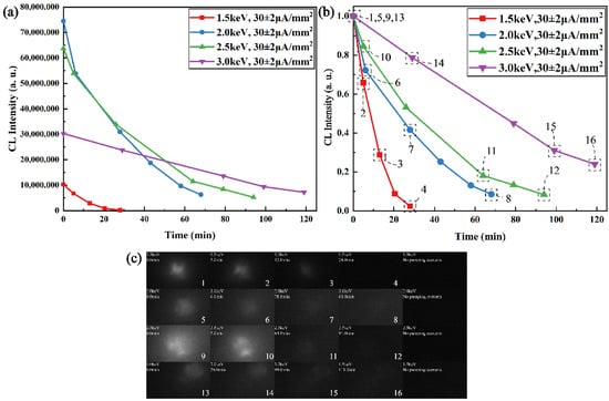 The main difference between luminescence aging failure and self-saturation luminescence testing lies in the high-power pumping duration. The luminescence aging failure experiment needs the EB-pumping system to work continuously and stably for more than one hour in the high-power mode. However, because of the obvious multiplier fatigue property after working long, MCPs are not suitable for aging failure testing. Therefore, in the subsequent aging failure experiments, we took advantage of a dual-mode EB source to pump the CsPbBr3 films in turns. In the first step, the CsPbBr3 films are constantly pumped and aged by a tungsten-thorium alloy direct thermal cathode whose currents output can reach 10 μA steadily. Every few minutes, the variation in the luminescence property can be sampled by the MCP pumping system. In addition, in order to reduce testing errors, the three holes on the mica sheet are enlarged into a square of 0.5 mm × 0.5 mm. The aging failure experiment and characterization of the square on the mica sheet are shown in Figure 6.