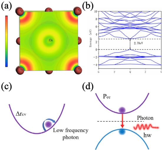 (a) Electron localization function of CsPbBr3 at (001) plane. (b) Band structure of the CsPbBr3. (c) Low-frequency photon radiation model. (d) Visible photon radiation model.
