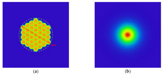 The fiber bundle of the fiber-coupled semiconductor laser used in this work consists of 37 fibers. Its exit end face is a regular hexagonal array, as shown in Figure 3. The diameter of the circumscribed circle is 2 mm, while the light beam divergence angle is 22°.