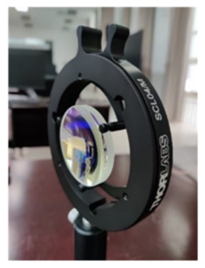 Solebo’s AL5040-B aspherical lens was selected as the beam collimation device. This aspheric lens has an effective focal length of 40 mm, a numerical aperture of 0.55, an outer diameter of 50 mm, a working distance of 31.3 mm, and a central thickness of 10.0 mm. Its material was S-LAH64. Figure 10 shows the image of the AL5040-B aspheric lens.