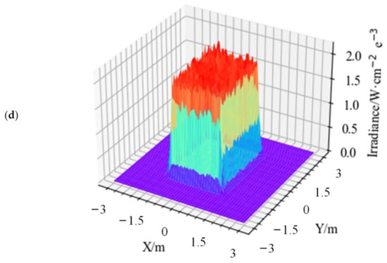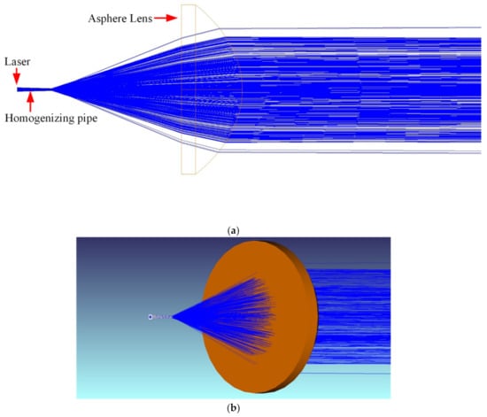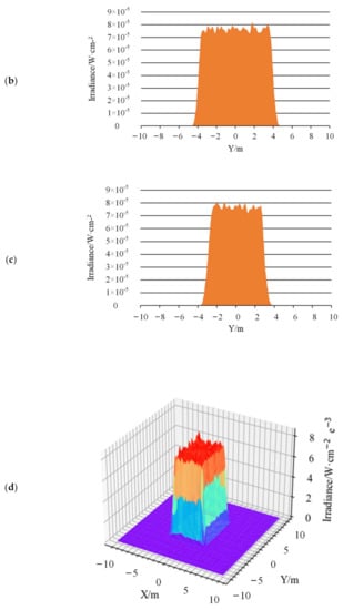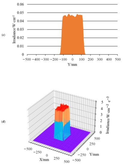 Figure 19 shows the simulated illumination system. Figure 19a is the 2D layout. Figure 19b is the shaded model layout. The laser beam was emitted from a fiber-coupled laser. Then, it was shaped into a uniform rectangular spot with an aspect ratio of 4:3 through a homogenizing pipe. Afterwards, it was collimated by an aspherical lens. Finally, a detector was set at a distance of 20 m, 120 m, and 500 m, respectively, to receive the laser spot.