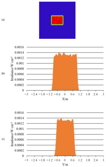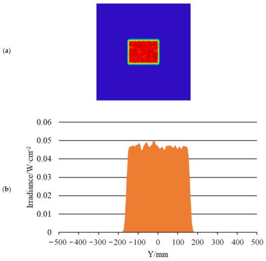 Comparing the light spot before and after the homogenizing pipe, it can be seen that the light spot is homogenized and shaped from the hexagonal array shown in Figure 4a into a uniformly distributed rectangular spot as shown in Figure 7. The simulation results suggested that the homogenizing pipe has the effect of shaping and homogenizing at the same time.