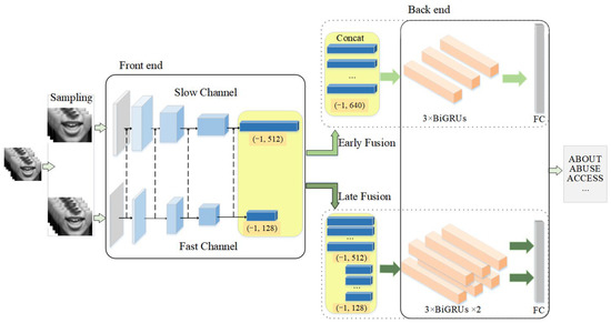 The overview of the Lip Slow-Fast (LSF). As shown in the picture above, the proposed model is a two-stream network. At first, the lip region sequence with different sampling intervals is input into two CNN streams; the above one is the slow channel, and the bottom one is the fast channel. The gray convolution is a shallow 3D CNN, and the others are 2D CNN. Then, the output feature vector will be input to the back-end model, which is a 3-layer Bi-Gated Recurrent Unit (BiGRU). In early fusion, the two feature vectors will concatenate together first and then do the sequence modeling; in late fusion, two feature vectors will send to the back-end model separately and concatenate together last. Finally, after a full connection layer, the model will predict the result of the input lip sequence.
