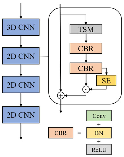 The implementation of the residual block in the proposed front-end. As shown in the picture above, in each residual block, the input data will first obtain the short-term time information through TSM. Then, go through the conventional convolution composed of two CBR. Finally, use the SE module to reweight the channel correlation.