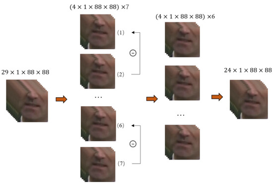The whole process is shown in Figure 5, and the data used is the sample of the LRW dataset, of which the total frame number is 29. We separate the origin sequence into seven subsequences, and each has four frames. Then subtract them from each other to get six differential sequences. Finally, these sequences are spliced in the temporal dimension to get a 24-frame subsequence. To realize this strategy, for an odd number of frames, the last frame is removed by default so that the frame number of each fragment is the same and will not be repeated.