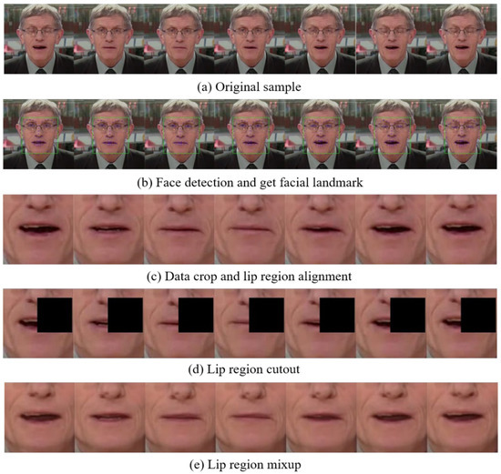 An example sample during data processing. As shown above, (a) is a part of the original data in the Lipreading in the Wild (LRW) dataset. (b) is the result of using the Dlib toolkit to get facial landmarks while the green rectangle is the region of the face, and the blue point is the facial landmarks. (c) is the process result of data crop and lip alignment. (d,e) is the result of mix-up and cutout during training.