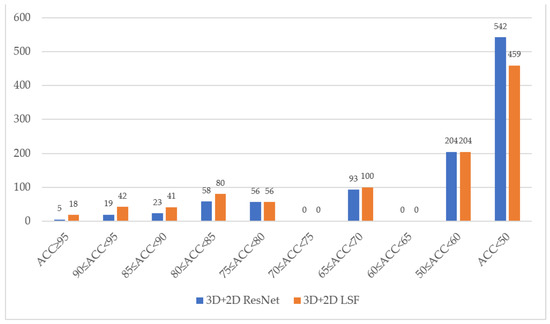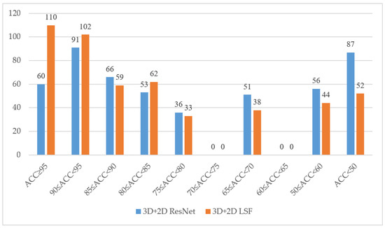 Figure 7 shows the effectiveness of our method for a single word in LRW. According to our statistics, there are 110 categories of words with a recognition rate of more than 95%; 212 categories of words with a recognition rate of more than 90%; 333 categories of words with a recognition rate of more than 80%; and 52 categories of words with a recognition rate of less than 50%. Compared with baseline, the number of samples whose recognition accuracy is more than 95% of LSF is doubled, while the number of samples whose recognition rate is less than 50% is reduced by 40%.