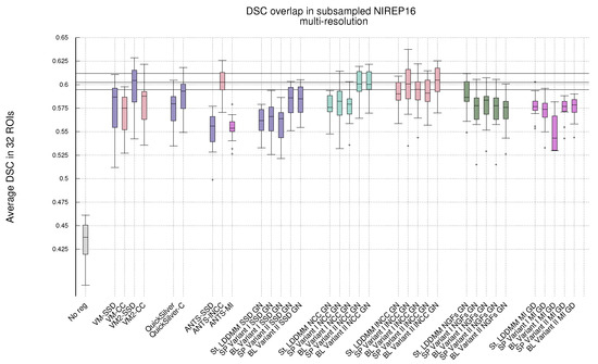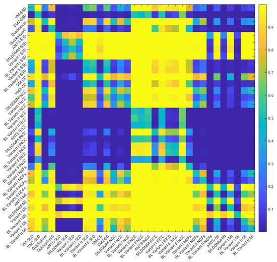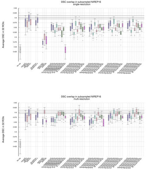 - Klein, A.; Andersson, J.; Ardekani, B.A.; Ashburner, J.; Avants, B.; Chiang, M.C.; Christensen, G.E.; Collins, D.L.; Gee, J.; Hellier, P.; et al. Evaluation of 14 nonlinear deformation algorithms applied to human brain MRI registration. Neuroimage 2009, 46, 786–802. [Google Scholar] [CrossRef] [PubMed]