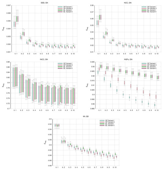 Table A2 shows the mean and the standard deviation of , , and the extrema of the Jacobian determinant obtained with the methods. For the spatial methods, gradient descent obtains the lowest values. For the BL methods, Gauss–Newton with the diagonal truncation shares the lowest values with gradient descent. The Jacobians reach more extreme values for the Gauss–Newton methods. These results break with the trend that we have observed for SSD and NCC-like metrics and open the possibility that, in some cases, gradient-descent finds better performing minima than Gauss–Newton–Krylov and it is, therefore, a preferable option.