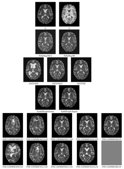 with initial condition [14,16]. The solution of Equation (5), , is the warped initial image. The image similarity metric is the sum of squared differences (SSD) between the intensities of and .
