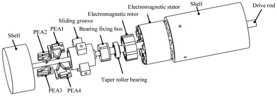 The internal structure of the actuator and the relative position between parts are shown in Figure 2. The parts in the shell from left to right are PEA, sliding groove box, bearing fixing box, tapered roller bearing, electromagnetic rotor, electromagnetic stator, and driving rod. The piezoelectric driving part is composed of four PEAs, PEA1 and PEA4 are a group, which shifts the driving rod to the right during operation; PEA2 and PEA3 are a group, which shifts the driving rod to the left during operation.