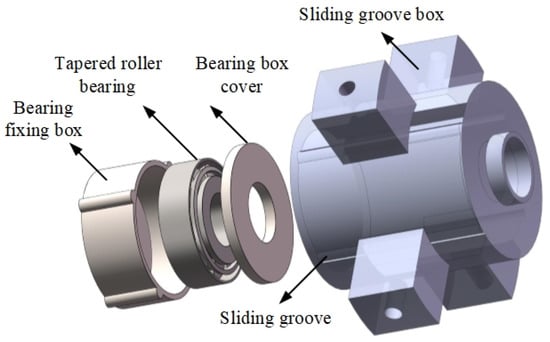 The connection of the piezoelectric part and the electromagnetic part is completed by a set of bearing devices, as shown in Figure 3. The tapered roller bearing is adopted as the bearing, which can be applied to the multi-DOF motion of the drive rod. The bearing fixing box is used to install and fix the bearing, and the external protrusion is used to assemble the groove in the sliding groove box. The inside of the sliding groove box is provided with a groove to provide the up and down sliding motion of the bearing fixing box in the groove, and the outside is provided with four protruding blocks of the support box, which are fixed on the shell by screws.