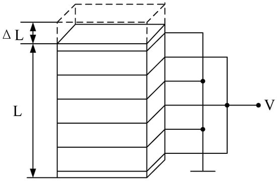 Each layer in the piezoelectric stack alternates between the positive electrode and the zero electrodes, and the layers are mechanically connected in series and electrically connected in parallel. Therefore, significant electron displacement can occur at a relatively low voltage. It is assumed that the PEA is a uniform beam with the cross-sectional area, material density, and Young’s modulus under axial force. In order to show that the material is uniform and isotropic, the mass and elasticity are uniformly distributed throughout the piezoelectric stack. The relationship between stress and strain follows Hooke’s law. A mathematical model is established, as shown in Figure 5.