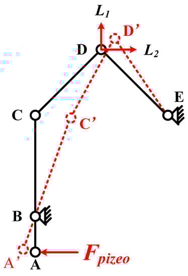 In order to analyze the movement process of thePEA, a kinematic model is established, as shown in Figure 8. Point A is the contact stress point between the piezoelectric stack and the hinge structure. The contact stress point moves from point A to point A’. Point B is the fulcrum of the lever structure, corresponding to the hinge part with one end fixed on the bracket. Point C is the connection point between the lever displacement amplification structure and the triangular displacement amplification structure, which moves to point C’ in the driving process. Point D is the contact point with the mover in the driving foot and moves to point D’ during the driving process. E is the connection point between the triangular displacement amplification structure and the bracket, which is the fixed point.