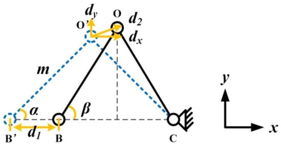 In the formula, m represents the length of the rigid connecting rod O’B’ (or OB). α is the angle between O’B’ and the x-direction. β is the angle between OB and the x-direction.The relationship between dx and d1 is calculated by the formula (12) and the formula (13):