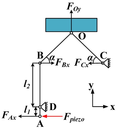 The force analysis of the PEA structure is carried out to determine that the two-stage displacement amplification structure can amplify the tensile displacement generated by the piezoelectric stack, as shown in Figure 10. The bar at the top of the figure represents the driven mover, and the lower part represents the simplified structural model of the PEA. Point O represents the contact point between the PEA and the mover. The x-axis represents the horizontal direction of the mover’s movement, and the y-axis represents the vertical direction of the applied clamping force.
