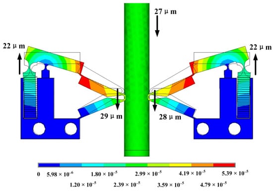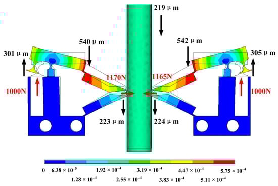 Through the static analysis of the simulation software, a 1000 N constant force is applied to the contact surface between the piezoelectric stack and the amplification structure, as shown in Figure 11. The magnification of the lever displacement amplification structure is 1.8 times, and the clamping forces generated between the driving feet and movers of the left and right PEAs are 1170 N and 1165 N, respectively, which are close to each other. The value of the clamping force is greater than the applied force, which shows that the structure plays a role in amplifying the clamping force. However, the magnification is less than 1.6 in theory.