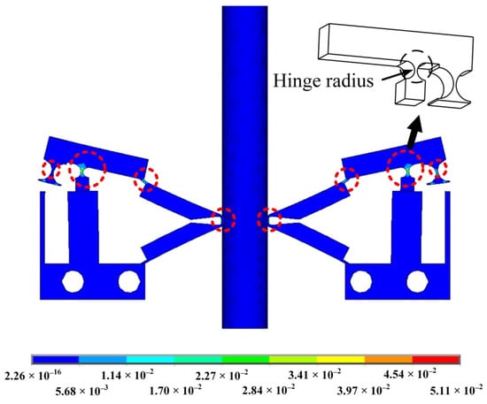According to the stress distribution in Figure 12, the main stress generated by the actuator during operation is concentrated in the place surrounded by a red circle. The largest circle in the figure is the fulcrum of the lever amplification structure, where the stress is most obvious. Therefore, optimizing the hinge can improve the overall performance of the actuator. The following parametric analysis of the radius of the hinge (Figure 10) can obtainan ideal hinge radius parameter.