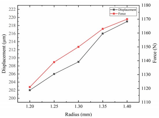 Figure 13 is the parametric analysis diagram of the hinge radius. The left coordinate axis represents the displacement of the mover. The right axis represents the clamping force between the driving foot and the mover. The lower axis represents the radius of the hinge. According to the curve, it can be seen that with the increase in the hinge radius, the displacement of the actuator increases, and the clamping force between the driving foot and the actuator also increases. A hinge radius of 1.4 mm is selected.