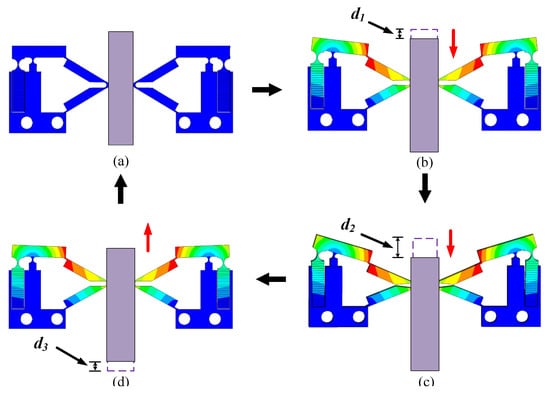 The operation process of the PEAs in one cycle is shown in Figure 14. Figure 14a shows the initial state of the actuator without voltage. Figure 14b shows a certain amount of deformation that the actuator begins to produce after the voltage is first applied to the actuator. The driving foot drives the mover to move downward, resulting in a displacement of d1. With the increase in voltage, the deformation of the actuator reaches the maximum. At this time, the displacement produced by the driving foot to the mover reaches the maximum value in this cycle. The mover moves down the displacement of d2 on the basis of d1, as shown in Figure 14c. Finally, the driving voltage is gradually reduced to zero. The actuator is restored to its initial state, as shown in Figure 14d. In this process, due to there still being a certain clamping force between the driving foot and the mover, the mover will produce a small amount of reverse displacement d3 under the action of friction. To sum up, the displacement generated by the actuator in one cycle is . Under the action of two actuators, the mover presents a stepping motion in multiple cycles.