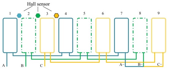 The coil end length of the concentrated winding is short, the copper loss is small, the efficiency is high, the winding has no overlap, the phase-to-phase insulation is good, the coil is easy to be mechanically offline, and the production cost is reduced. The coil winding mode is shown in Figure 17. Three blue coils are connected in series to form A-phase winding, three green coils are connected in series to form B-phase winding, and three yellow coils are connected in series to form C-phase winding. Nine coils form a three-phase winding, and the ends of the three phases are connected to form a star connection method.