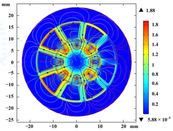 The magnetic flux density distribution under the static state is shown in Figure 19. The magnetic field is concentrated in the permanent magnet and air gap, so the magnetic fields in the permanent magnet and air gap are analyzed, respectively.