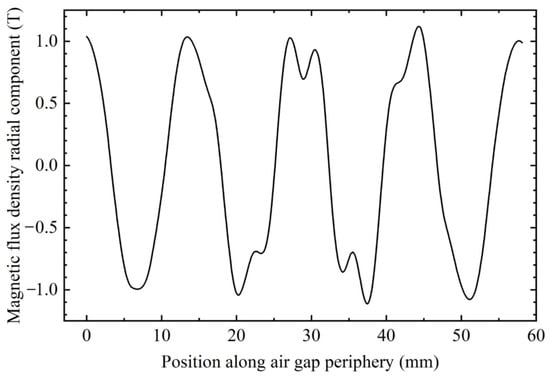 The spatial distribution of air gap flux in a synchronous actuator is very important. Figure 20 shows the variation curve of radial flux along the periphery of theair gap. It can be seen from the figure that the magnetic flux presents an approximate sinusoidal distribution, which shows that the actuator can avoid the introduction of higher harmonics.